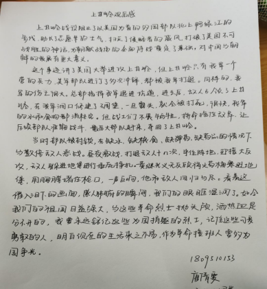 讲解结束后,为让同学们更加深刻了解中国人民志愿军的精神与抗美援朝战争胜利的意义,刘琦同学又组织进行了抗美援朝经典影片《上甘岭》电影赏析。虽然这部电影并没有太多特效场面,只有黑白成像,但丝毫不影响这段催人泪下的历史战争再次重现,虽身处和平盛世,同学们依旧被惨烈的战争场面所深深震撼。影片结束后,同学们自发的写了观影心得,表达了他们内心的想法。2018级应用物理1班唐倩雯同学写到:“如今我们的祖国日益强大,与这些革命烈士抛头颅,洒热血是分不开的,我要永远铭记这些为国捐躯的烈士,记住这些可爱勇敢的人,明白现在的生活来之不易,作为革命接班人要多为国争光。”