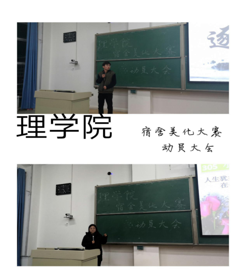 本次宿舍美化大赛以“与‘理’相遇,一见钟‘寝’”为主题,以动员各位新生对宿舍进行美化为目的展开。首先安星老师指出宿舍是大学中的港湾,宿舍的卫生环境体现了一个宿舍的舍风,舍风将影响宿舍成员的老员工活和学习。安老师提出要以最简洁且手工制作的方式美化宿舍,同时注意美化过程中的安全问题以及舍友们之间的团结协作,共同设计布置一个温馨、青春阳光化的宿舍。接着,由2018级各优秀宿舍代表用精美的PPT展示他们宿舍的美化成果,为新生美化宿舍提供了一些装饰想法和方法。最后,由生活部部长李浩杰,团委副书记王毅对本次会议进行总结评论,并再次强调了美化宿舍的重要性。