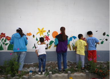 图为队员们与孩子们一同绘制墙面