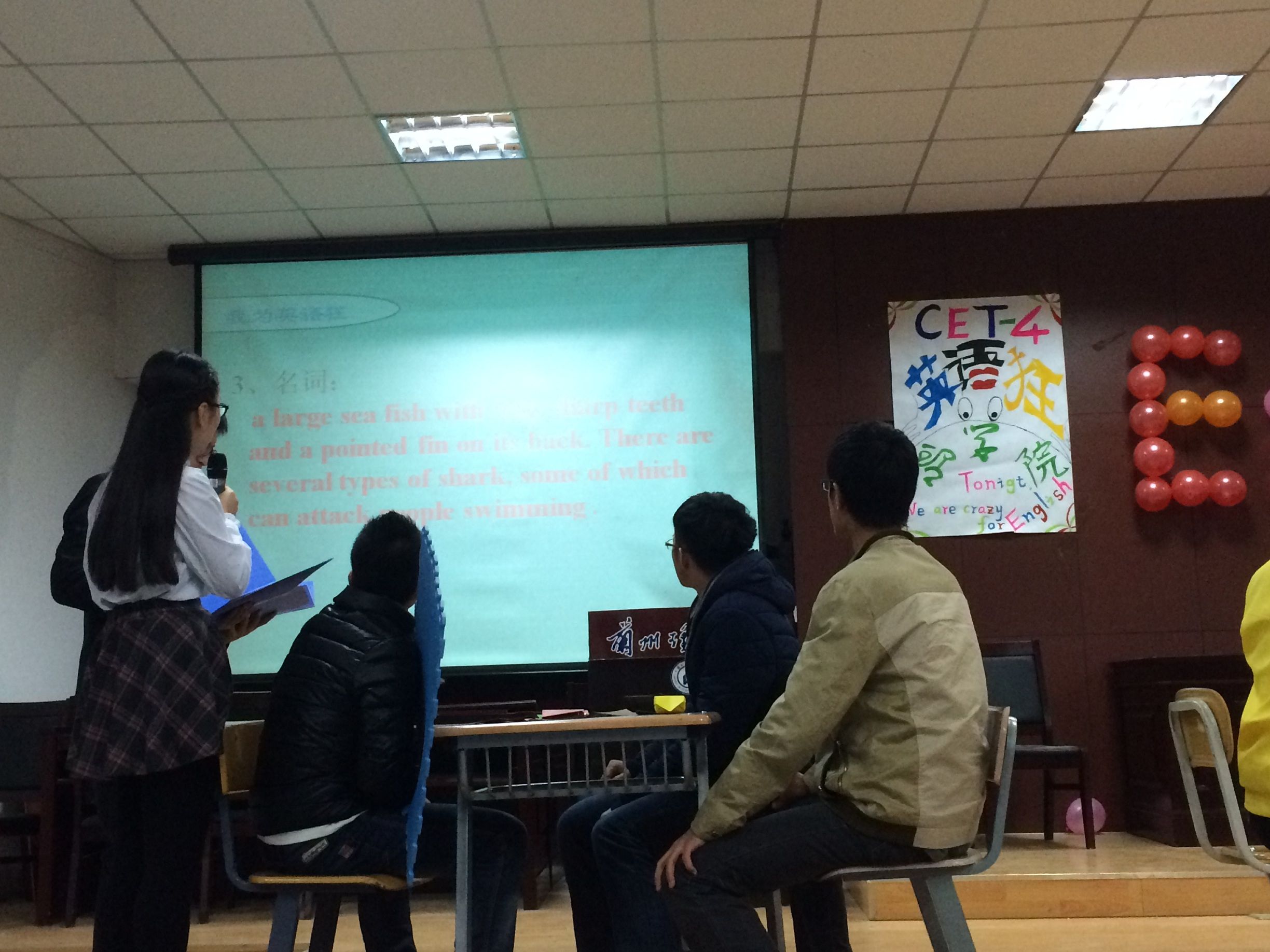 2015年12月3日晚,德信体育官网员工会1号楼108大型阶梯教室举办了“我为英语狂”趣味活动,15级全体同学参加了此次活动,并邀请了一次性高分通过四级和六级的原佩君、吴贤德两位高年级同学作为嘉宾到场助兴,与大一的新生分享了英语四六级过关经验和学习英语的方法。。
