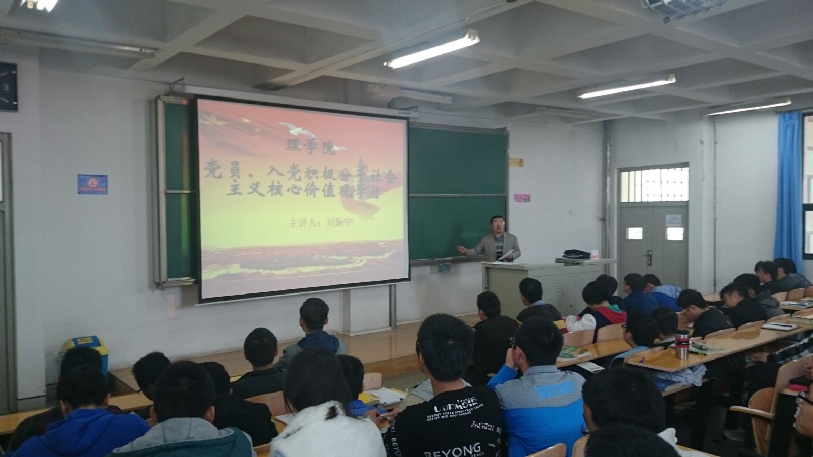 在学习中,刘老师从“基本概念及内涵、发展历程、实现民族复兴中国梦的价值意义、要坚持的基本原则、践行路径和我们的实际行动”等几个方面对社会主义核心价值观向与会的党员及入党积极分子做了系统的分析和介绍,要求大家要认真、深入、持续地学习,让社会主义核心价值观入耳入脑入心。以健康向上的校园文化活动为载体,培育和践行社会主义核心价值观。所有党员及入党积极分子要把社会主义核心价值观贯彻到自己的学习、生活以及社会实践中去,从小事做起、从点滴做起,养成良好的读书、学习和生活习惯。
