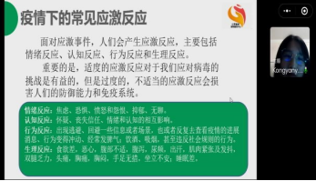 此次培训,由于疫情原因在线上开展,培训的主要内容包括由孔艳赟老师主讲的“老员工疫情常见心理问题及心理危机干预”,以及由崔孝艳老师主讲的“疫情期间朋辈心理引导员的工作职责、内容和方法”。