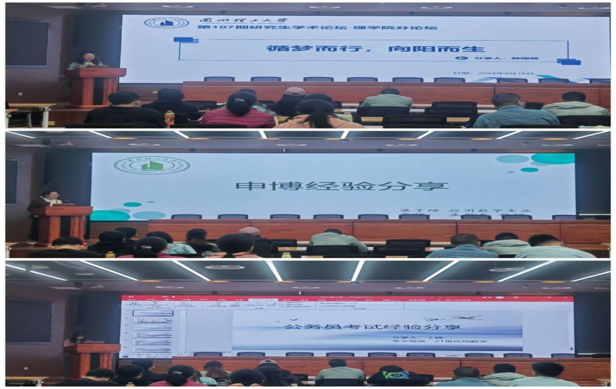 论坛邀请了21级研究生丁倩、梁子维和韩雨萌分别分享了就业和学习经验。丁倩同学通过自己参加公务员考试的过程讲解、笔试经验和面试经验的详细汇报,分享了备考经验,强调了时间管理的重要性。梁子维同学通过对申博的总体安排和具体细节的讲解,分享了申博的有效经验,向同学们传达出要有多做少想、奋发向上的精神风貌。韩雨萌同学从学好专业课程、确定就业目标和社会实践成长等方面分享了考公的备考经验,她希望同学们能清醒地确定自己的目标并为自己的目标而努力奋斗。
