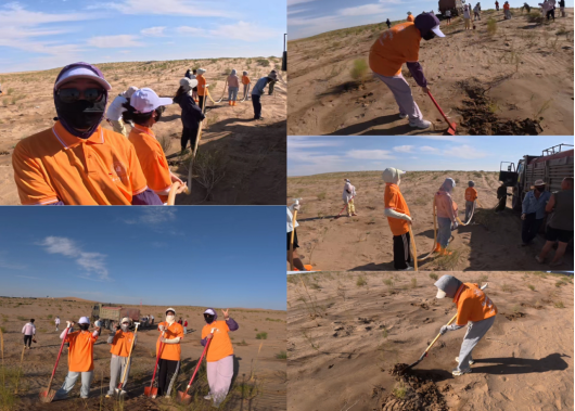 告别田野绿意,实践队走进了民勤县青土湖公益林防沙治沙基地,通过植树助力生态保护。