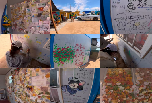 除了养护劳动,队员们还将艺术表达引入生态宣教。在公益林基地,他们绘制墙画,并题下誓言:“青山不负少年行,沙退绿进,我们在行动。”