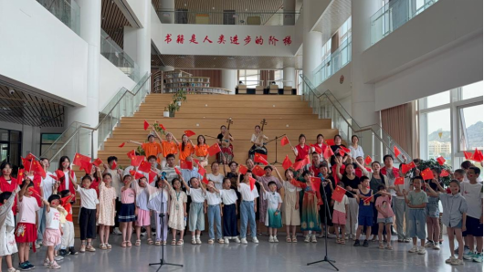 16日下午,图书馆大厅内弦音袅袅。实践队与共青团靖远县委、县文体广电和旅游局协同举办了“弦歌不辍·文脉流芳”琵琶快闪活动。青年琵琶演奏者以一曲《十面埋伏》破题,急促的轮指如万马奔腾;转而演奏《市集》时,明快旋律勾勒出人间烟火气,引得观众自发跟拍哼唱。临近活动尾声,在实践队员与志愿者们的带领下,观众们共同唱响《我和我的祖国》,弦音与歌声在书架间回荡,家国情怀在浓郁的书香中缓缓流淌,将整场活动的气氛推向高潮。
