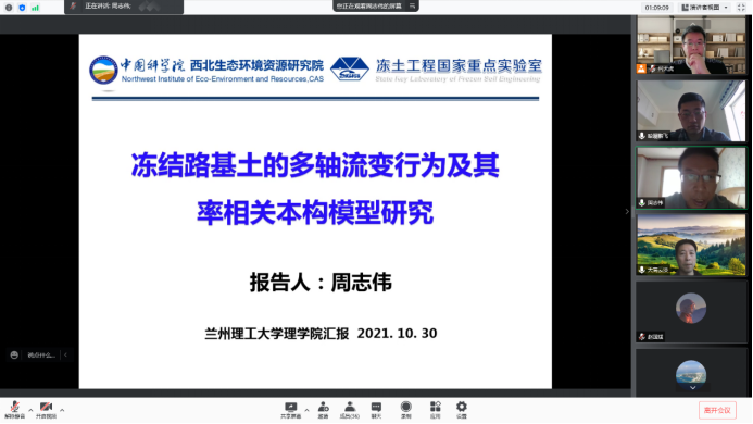 中国科公司西北生态环境资源研究院、冻土工程国家重点实验室周志伟副研究员做了题为《冻结路基的多轴流变行为及其率相关本构模型研究》的学术报告。报告人考虑了冻土显著的流变属性,根据不同热、力路径的流变试验,研究了冻土的蠕变特征和长期强度演化特征,进而拟定相关参数,从热力学理论出发构建了普适性较强的冻土率相关本构模型。