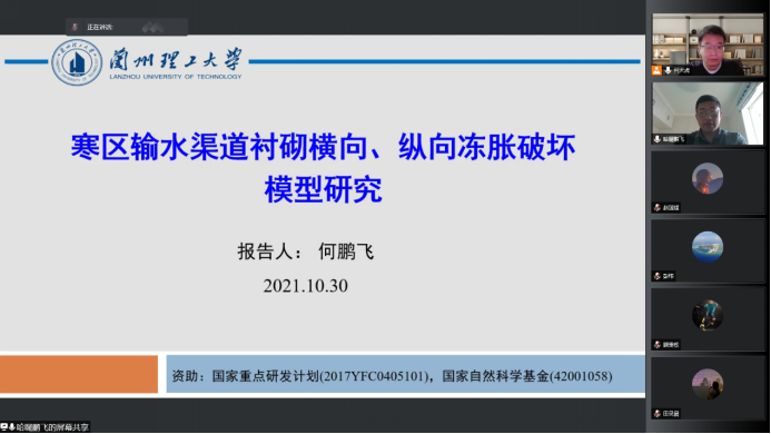 德信体育青年教师何鹏飞以高寒区输水渠道为工程背景,做了题为《寒区输水渠道衬砌横向、纵向冻胀破坏模型研究》的学术报告。报告人介绍了寒区输水渠道面临的冻害问题和冻害特征,在考虑冻土和衬砌的相互作用的情形下,建立了衬砌板在横向和纵向方向的力学分析模型,对工程实例进行了分析计算,为设计施工提供了理论支撑。