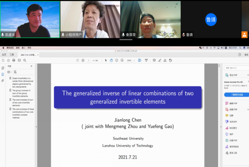 陈建龙教授作了题为The generalized inverses of linear combinations of two generalized invertible elements的报告。首先,给出了在一定条件下由两个幂等项生成的某个有限维代数中元素的Drazin逆的存在判断和公式。其次,在Dedekind有限环中,给出了不同条件下两个群的可逆元和群逆。然后,研究了两个核心可逆元素之和的核心逆。最后提出了两个核心可逆复矩阵的线性组合的核心逆。