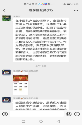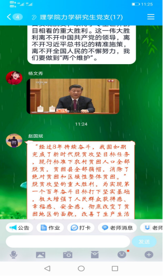 在中国共产党的坚强领导下,全国近1亿贫困人口全部脱贫,第一个百年梦想如期实现。在观看直播的过程中,公司党委各党支部开展了热烈的讨论交流,大家有感于自己家乡面貌的改变、脱贫攻坚先进个人的感人事迹,同时结合脱贫攻坚主题电视剧《山海情》等畅谈对脱贫攻坚的感受。例如力学研究生支部曹晨曦表示:对脱贫攻坚的感受在于家门口越来越多来自农村的农贸产品在出售。从农民们的言语中感受到农村现在路修的好了,种地种菜养猪养鸡有人指导帮扶了,日子也越来越好了。本科生物理支部徐顺芳表示消费扶贫让贫困群众搭上了快车,让群众的腰包鼓起来了。教师党员张晓锋表示全面建成小康社会,是我们党对全国人民的庄严承诺,必须实现。公司党委李建东书记表示:历史伟业充分体现了集中力量办大事的体制优势和中国共产党人咬定青山不放松的精神品格。我们一定要紧密团结在以习近平同志为核心的党中央周围,继承发扬好脱贫攻坚精神,紧紧围绕立德树人根本任务,努力培养德智体美劳全面发展的时代新人,为建设现代化国家做出应有的贡献。