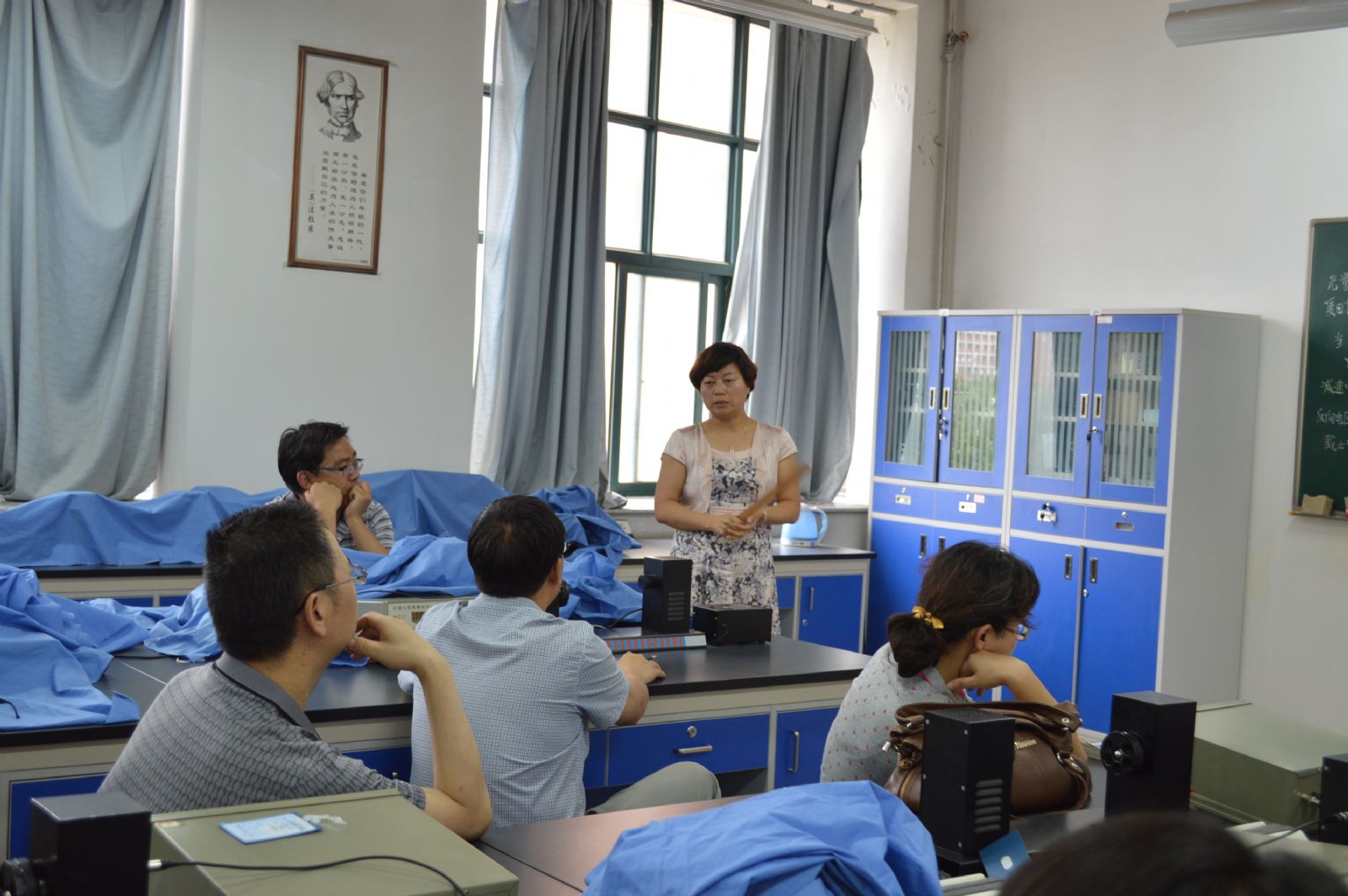 为了进一步提高教学质量,将理论课和实践训练紧密结合,2014年7月7日下午,德信体育官网物理系全体教师到西区物理实验室进行实验课观摩教学。物理实验室主任褚润通副教授组织了实验课观摩教学工作,其中苏俊燕老师现场示范和讲授了“密立根油滴实验”,王春妮副教授现场讲解和示范了“光电效应实验”。两位老师对实验原理,背景意义、操作细节和注意事项、数据处理等给出细致的讲解和示范。参加观摩课的教学经理王青教授,系部主任戴剑锋教授、马军教授以及听课观摩的老师们对本次实验教学观摩效果和实验室的管理工作等表示肯定。
