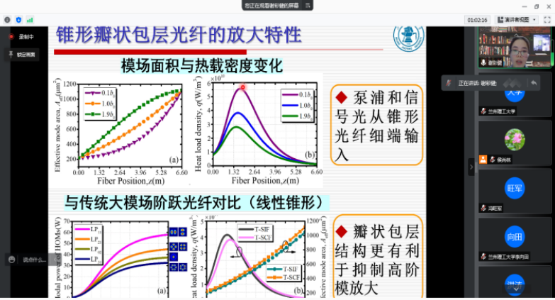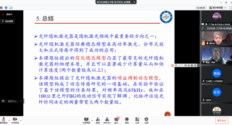 会议的开始首先由梅忠磊教授做了题为“电磁超表面的理论与应用研究”的精彩报告,报告结合团队的工作,对电磁超表面的理论及应用作了详细的讲解。陆丹研究员的报告“用于微波信号产生的光子集成芯片”展示了利用InP基光子集成芯片实现多功能微波信号产生的相关工作。王子南教授的报告“面向传感应用的光纤随机激光建模研究”首先回顾光纤随机激光近年来的重要研究进展,然后探讨了基于光纤随机激光的准分布式传感建模研究。之后,贾武高工的报告“面向5G及新兴业务的光接入网及FTTR”、王帅副研究员的报告“自适应光学及激光操控”、陈俊学副教授的报告“二维布洛赫表面波的偏振调控特性研究”、王茹博士后的报告“等离激元耦合纳米腔的光学特性研究”、谢彩健博士的报告“光纤激光系统的光学非线性研究”及公司计算机与通信公司张悦老师的报告“无线光通信中的增强型空间调制技术研究”顺序展开。除此之外,公司硕士研究生叶归清、吴照恒、贾天旭、朱剑凯、范世卓、王亚捷等六位同学分别就当前所做课题做了详细的汇报,报告所涉及的内容引起参会师生的热烈讨论。