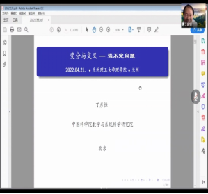 丁彦恒研究员与郭玉劲教授分别做了题为《变分与交叉 ---强不定问题》及《玻色-爱因斯坦凝聚现象的变分理论》的精彩学术报告。报告结束后,两位报告人详细解答了师生提出的相关问题,鼓励年轻人勇于做前沿及难点问题。同时,就当前疫情形式下的教学与科研展开了探讨与交流。通过此次学习交流,一方面让相关研究生了解了当前的学术前沿及热点,同时也加强了与同行之间的学术交流。