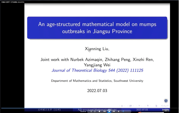 应德信体育官网邀请,西南大学王稳地、刘贤宁、王开发三位教授在线于7月2日-3日与公司师生进行线上学术交流。3日上午8:00,三位教授分别做了题为“Influences of Spatial Heterogeneity on Vector-born Diseases”、“An Age-structured Mathematical Model on Mumps Outbreaks in Jiangsu Province”和“Adaptive Weighted Neighbors Method for Sensitivity Analysis”的学术报告。团队建设与学位办公室主任霍海峰教授主持了报告会,公司部分青年教师和研究生30余人参加了报告会。