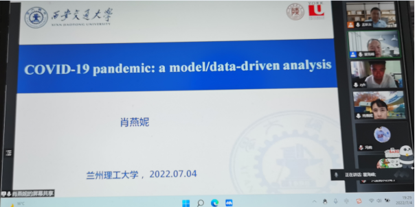 肖燕妮教授做了题为“Covid-19 pandemic: a model/data-driven analysis”的报告,该报告从数据的多样性背景出发,结合传统的微分方程动力学传染病模型,进行了学科交叉探索,并对当下前沿的Covid-19防控工作进行了综述,介绍了如下几个方面的阶段性研究成果:1)新冠的早期预测预警;2)资源有限性条件下的疾病防控;3)大众传媒对新冠传播动力学产生的影响;4)最优流动模式—解封方式的确定;5)不同年龄下病毒传播动力学差异。