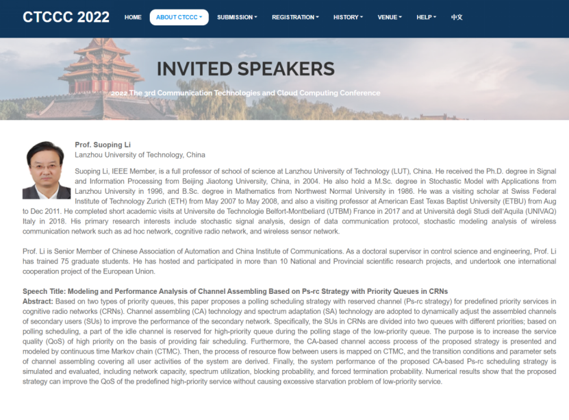 受大会组委会的邀请,2022年8月28日,德信体育官网黎锁平教授担任了“The 3rd Communication Technologies and Cloud Computing Conference(CTCCC 2022,第三届通信技术与云计算国际会议)”技术委员会委员,并作题为“Modeling and Performance Analysis of Channel Assembling Based on Ps-rc Strategy with Priority Queues in CRNs”的特邀报告。该报告对其课题组所取得的一项有意义的研究成果做了汇报,即考虑到仅基于异构业务的分级方案并没有关注到特殊场景下包含重要信息的弹性业务得问题(如紧急救援场景下患者的重要生命数据),课题组为认知无线电网络信道装配技术提出了一种基于优先级的预留信道的轮询调度(Ps-rc)策略,以实现在不造成低优先级用户饥饿的情况下保障高优先级用户的服务得目的。报告结合信道装配技术和频谱自适应技术,给出了Ps-rc调度策略的实现方法,通过将系统的状态转移触发事件分为四类建立了连续时间Markov链,刻画了次级系统中的资源流动过程,获得了次级系统网络容量、频谱利用率、阻塞概率、强行终止率等性能指标的解析式。研究结果在混合多类型业务的认知无线电网络中能够保障预定义优先级用户的服务质量。研究成果发表于国际著名期刊《Wireless Communications and Mobile Computing》(Volume 2022, Article ID 6384261, 17 pages,Volume 2022, Article ID 6384261, 17 pages,作者:Suoping Li,Qianyu Xu,Jaafar Gaber)。黎锁平教授的特邀报告引起了与会人员的兴趣和讨论,扩大了公司的学术声誉。