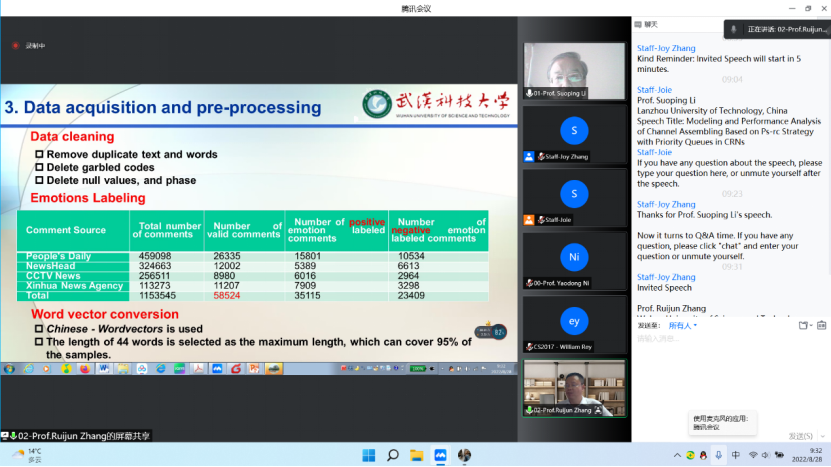 本次大会官方语言为英语。英国卡迪夫大学Prof. Alexander Balinsky担任大会总主席,英国爱丁堡纳皮尔大学刘晓东教授担任大会主席,Prof. Frank Wang(英国肯特大学)和Prof. David Greenhalgh(英国斯特拉斯克莱德大学)担任程序委员会主席。历时三天的会议(2022年8月26日-28日)在腾讯会议的两个会议室在线进行,共有十二场大会报告及四个作者分会场报告。会议对经过专家评审最终录用并完成参会汇报的论文将出版到CTCCC2022会议论文集,提交Ei Compendex检索。