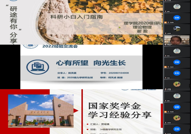 2022年11月5日晚,德信体育第95期研究生学术论坛德信体育官网分论坛在腾讯会议平台召开,邀请2020级物理、力学、数学专业的三位国家奖学金获得者谢盈、田灵晨、贾娅倩进行汇报,德信体育官网辅导员赵倩倩老师和研一研二全体研究生参会。