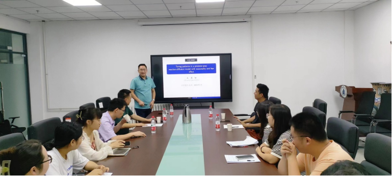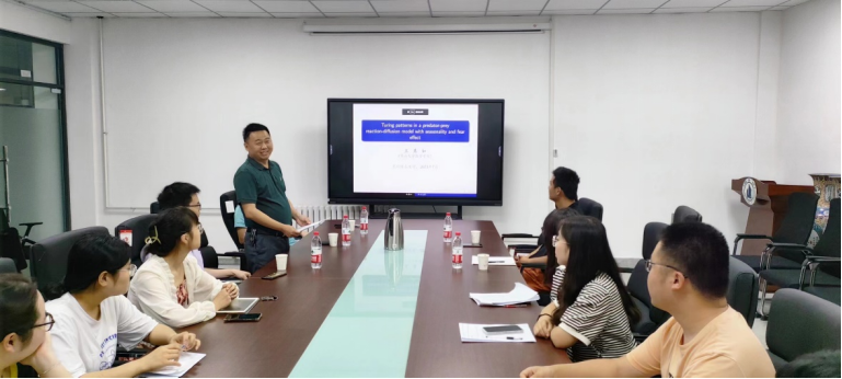 王其如教授做了题为《Turing patterns in a predator-prey reaction-diffusion model with seasonality and fear effect》的精彩学术报告。报告结束后,王教授详细地解答了师生提出的相关问题,并且就共同关注的热点问题、公司产品等展开了探讨与交流。通过此次学习交流,让在读的研究生了解了当前的学术前沿及热点,同时也加强了与同行之间的学术交流。