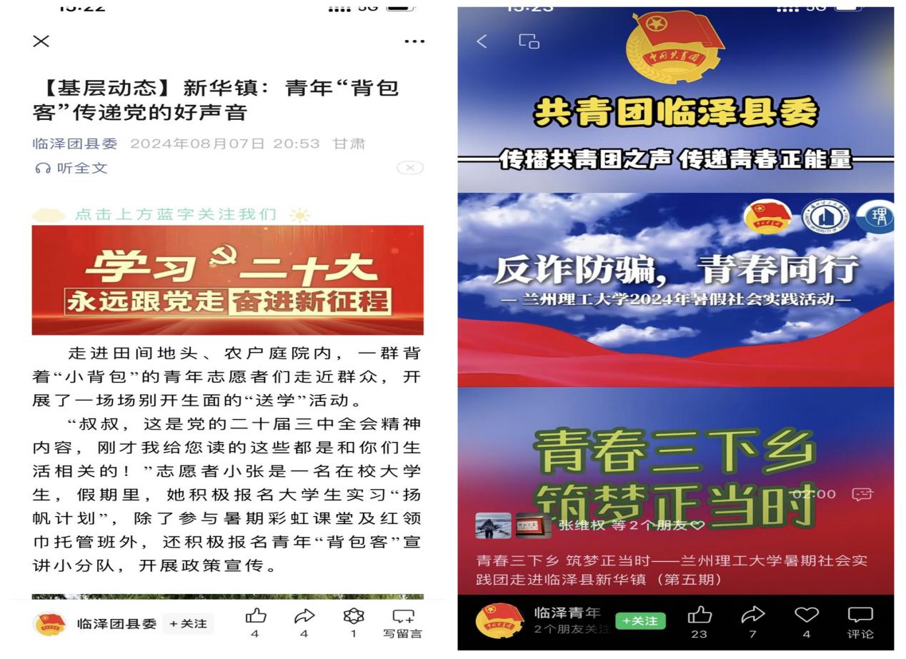 “反诈防骗,青春同行”实践团走进张掖市临泽县新华镇派出所了解该地区发生的电信诈骗情况,并对新华镇宣威村、胜利村、西街村、大寨村、新盛社区乡村进行调研和宣讲。在当地企业前进牧业进行参观访问以及防诈宣传,团队成员认真聆听企业介绍,深入了解诈骗情况。另外通过与当地居民的交流,了解常见的诈骗手段。通过对各个乡村的宣传以及走访,对该地区居民的防诈骗情况进行了解。大家深刻认识到,防电信诈骗不只是口号,还需要付出实际行动。这不仅是每个人的责任,还是我们每个老员工应尽的义务。该团队的实践情况得到当地镇政府的一致好评和宣传报道。此外,德信体育官网还有80余名同学通过根据自身专业学习、科研训练、就业目标及方向等实际情况,以个人形式参与暑期“返家乡”社会实践。