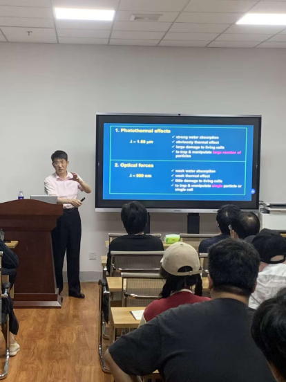 李宝军教授的报告,主要介绍了其团队在光学、生物、医学交叉领域中的突破性成果—用光学纳米探针来捕获和操控粒子(纳米颗粒、细胞等)。他们基于光力原理,用锥形纳米光纤探针实现了活细胞的捕获。沿着纳米探针传播的光可以在单细胞上实现聚焦,其聚焦光斑的半高全宽约200 nm,从而实现了对单细胞的操纵,同时还能实现亚波长空间分辨的实时荧光信号检测。他们的研究工作得到了国内外广大光学、生物、医学领域研究者的关注与认可。