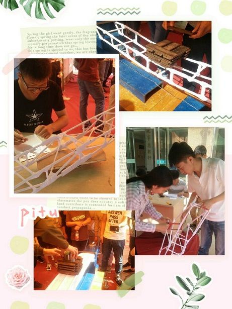 本次大赛的命题是“承受静载荷的单跨桥梁结构模型设计”,大赛要求参赛队利用指定的材料,设计并制作限定规格的桥梁。竞赛内容包括模型设计、承重评比、颁奖等环节。本次大赛共吸引了全校100多支队伍踊跃参加, 5月19日下午13点,紧张、激烈的现场模型承重比赛开始了,桥梁安装完毕后,选手们小心谨慎地加载铁块,直到最后桥梁断裂。组委会为保证大赛的公正性,特安排工作人员和其它参赛选手进行材料检查,检查签字确认后成绩视为有效。最后,所有符合设计制作要求的模型按荷重比由大到小排序,依照决赛成绩经评审组审定,评出模型承载力一等奖(1组)、模型承载力二等奖(3组)、模型承载力三等奖(5组)、其他奖(10组)。