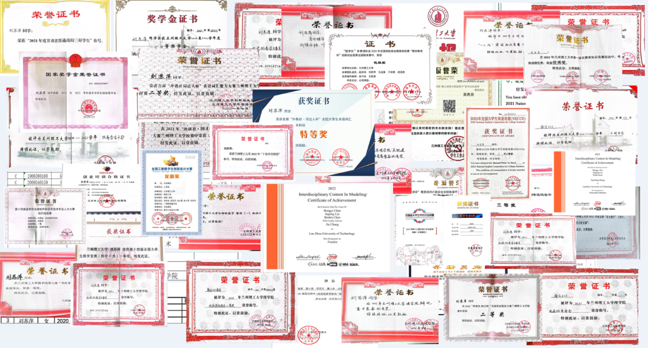 省级:甘肃省三好员工;全国老员工英语词汇能力大赛甘肃赛区特等奖;全国老员工数学竞赛(数学类)省一等奖(全省第5)、省三等奖;全国3D设计大赛省三等奖;省级大创立项1项。
