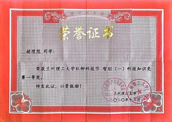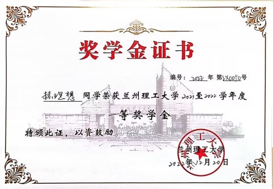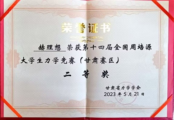 获奖情况:曾获得甘肃省老员工学科专业竞赛一等奖,第十四届全国周培源老员工力学竞赛二等奖(甘肃赛区)、优秀奖(个人赛),两次国家励志奖学金,多次校级一等奖学金。